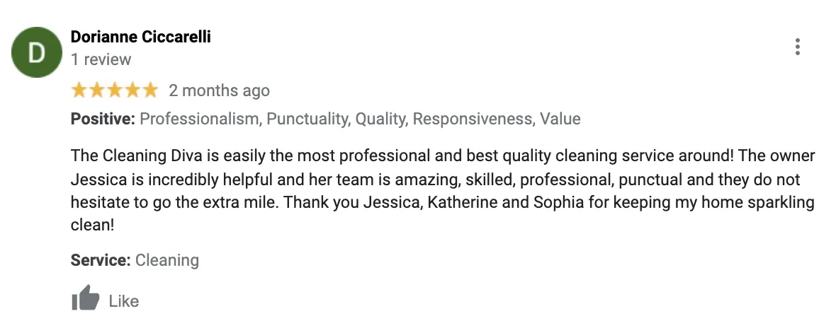 Jessica and The Cleaning Divas are amazing. There is never a time she can’t accommodate our needs and they are absolutely thorough, professional and reliable. They are always on time and efficient. I can’t tell you how much easier my life is because of their help with cleaning our home. With an 18 month old at home and working full time, my husband and I don’t have the time (or energy) to clean our whole house...that’s where the Divas come to the rescue! We are SO thankful to have them not only clean our home but do an amazing job! We are forever fans of The Cleaning Diva!